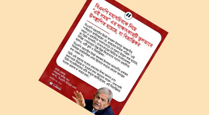 আরও বলা হয়, বিএনপি মহাসচিব মির্জা ফখরুল ইসলাম আলমগীর স্পষ্টভাবে জানিয়েছেন যে, ভারতের দৈনিক পত্রিকা “এই সময়”-এ প্রকাশিত সাক্ষাৎকারে যে বক্তব্য উল্লেখ করা হয়েছে, তা তিনি বলেননি। সাক্ষাৎকারের ভিত্তিতে বাংলাদেশের বিভিন্ন গণমাধ্যমে ভিন্ন ভিন্ন শিরোনামে সংবাদ প্রকাশিত হলেও, এটি ভুল ও বিভ্রান্তিকর।