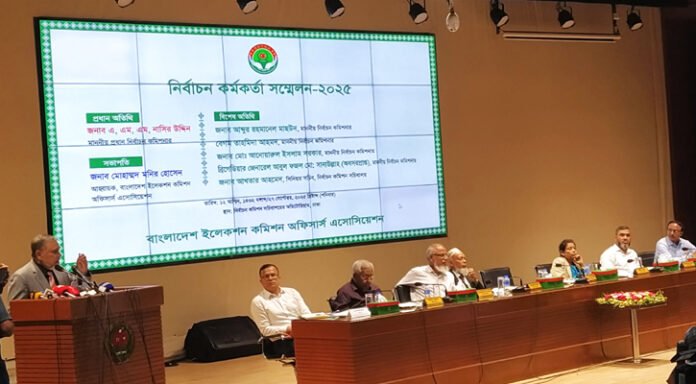 বাংলাদেশ ইলেকশন কমিশন অফিসার্স অ্যাসোসিয়েশন আয়োজিত নির্বাচন কর্মকর্তা সম্মেলন-২০২৫ অনুষ্ঠানে সভাপতিত্ব করেন আয়োজক সংগঠনের আহ্বায়ক মোহাম্মদ মনির হোসেন। এ সময় নির্বাচন কমিশন সচিব ও অন্যান্য নির্বাচন কমিশনার এবং ইসি কর্মকর্তারা উপস্থিত ছিলেন।