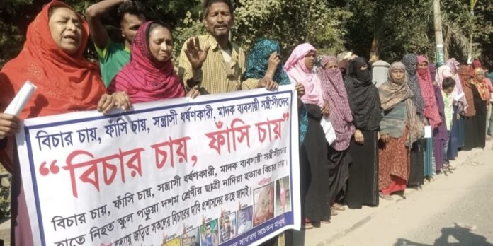 মানববন্ধনে নাদিয়ার স্বজন শিল্পি বেগম, সকিনা আক্তার, জলি খাতুন সহ স্থানীয় বহু মানুষ অংশ নেন। তারা অবিলম্বে এই ঘটনার সুষ্ঠু তদন্ত ও দ্রুত বিচারের মাধ্যমে প্রধান অভিযুক্ত প্রেমিক নাজমুলের ফাঁসির দণ্ড কার্যকর করার দাবি জানান। তাদের মতে, এটি একটি সুপরিকল্পিত হত্যাকাণ্ড,কোনোভাবেই আত্মহত্যা নয়।