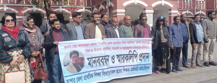 দুর্নীতির অভিযোগে যশোর জেলা প্রাথমিক শিক্ষা অফিসার আশরাফুল আলমকে গ্রেপ্তারের প্রতিবাদে মানববন্ধন কর্মসূচি পালন করেছেন প্রাথমিক শিক্ষা বিভাগের শিক্ষক ও কর্মকর্তারা।