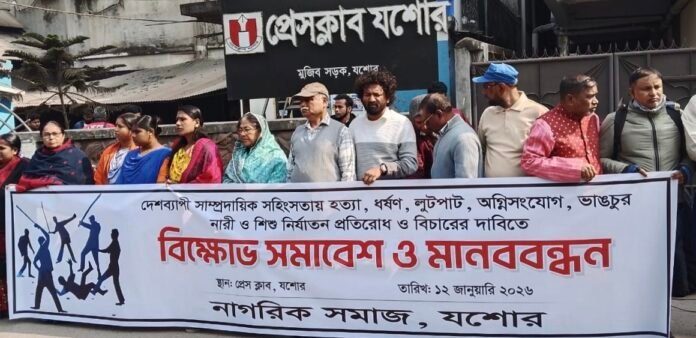 দেশব্যাপী সাম্প্রদায়িক সহিংসতা, হত্যা, ধর্ষণ, অগ্নিসংযোগ এবং নারী ও শিশু নির্যাতনের প্রতিরোধ ও বিচারের দাবিতে যশোরে মানববন্ধন করেছে নাগরিক সমাজ।