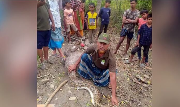 ছোট হয়ে আসা ভোলা নদীর পশ্চিম পাড়ে সুন্দরবন আর পূর্ব পাড়ে রসুলপুর গ্রাম। ওই গ্রামের সোহরাব ফরাজীর একটি ছাগল অন্যদিনের মতো সকালে ঘাস খেতে ভোলা নদীর চরে যায়। দীর্ঘ সময় পরেও ছাগলটিকে আর না পেয়ে খোঁজাখুঁজি শুরু হলে পাশের ঝোপঝাড়ের মাঝে বিশাল আকৃতির অজগরটি দেখতে পান স্থানীয়রা। অজগরটির পেট অস্বাভাবিক ফোলা ছিল। তা দেখেই সবাই ধারণা করছে, অজগরটি ওই ছাগলটিকে গিলে খেয়েছে। সেখানে অজগরটি ভালোভাবে নড়াচড়াও করতে পারছিল না।