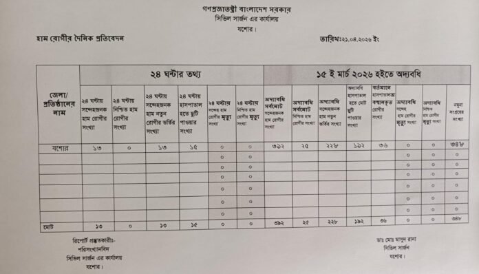 যশোরেহাম রোগীর সংখ্যা উদ্বেগজনক হারে বাড়ছে। সিভিল সার্জন কার্যালয়ের সর্বশেষ দৈনিক প্রতিবেদনে দেখা গেছে, গত ২৪ ঘণ্টায় নতুন করে ১৩ জন হাম রোগী শনাক্ত হয়েছেন।