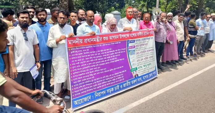 মাননীয় প্রধানমন্ত্রীর যশোর সফরকে ঘিরে জেলার সার্বিক উন্নয়নের দাবিতে মানববন্ধন কর্মসূচি পালন করেছে ‘নিরাপদ সড়ক চাই’ ও জাতীয় তরুণ সংঘ। বৃহস্পতিবার দুপুরে প্রেসক্লাব যশোরের সামনে অনুষ্ঠিত এ কর্মসূচিতে বিভিন্ন শ্রেণি-পেশার মানুষ অংশগ্রহণ করেন।
